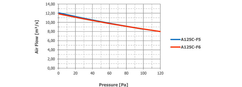 Der Luftstrom und der Schalldruckpegel (SPL) sind für den Freiblasebetrieb mit Einlass- und Auslassschutzgittern angegeben. Die SPL-Werte in 1 m Abstand wurden seitlich am Ventilator gemessen. Die SPL-Werte in 2 m Abstand wurden gemäß dem inversen Quadratgesetz berechnet. Die deklarierten Werte können je nach angeforderten Optionen und Konfigurationen variieren.