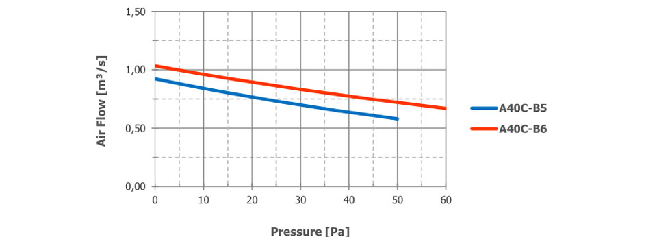 Der Luftstrom und der Schalldruckpegel (SPL) werden für den freien Ausblasbetrieb mit Einlass- und Auslassschutzgittern angegeben. Die SPL-Werte in 1 m Entfernung wurden seitlich am Ventilator gemessen. Die SPL-Werte in 2 m Entfernung wurden nach dem inversen Quadratgesetz berechnet. Die angegebenen Werte können je nach gewünschten Optionen und Konfigurationen variieren.
