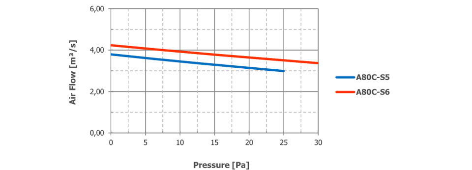 Der Luftstrom und der Schalldruckpegel (SPL) werden für den Freiblasebetrieb mit Einlass- und Auslassschutzgittern angegeben. Die SPL-Werte in 1 m Entfernung wurden seitlich am Ventilator gemessen. Die SPL-Werte in 2 m Entfernung wurden gemäß dem inversen Quadratgesetz berechnet. Die angegebenen Werte können je nach gewünschten Optionen und Konfigurationen variieren.