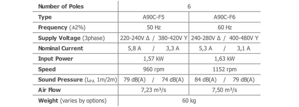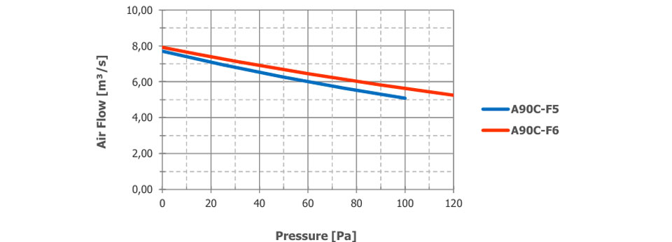 Der Luftstrom und der Schalldruckpegel (SPL) werden für den Freiblasebetrieb mit Einlass- und Auslassschutzgittern angegeben. Die SPL-Werte in 1 m Entfernung wurden seitlich am Ventilator gemessen. Die SPL-Werte in 2 m Entfernung wurden mithilfe des inversen Quadratgesetzes berechnet. Die angegebenen Werte können je nach gewünschten Optionen und Konfigurationen variieren.